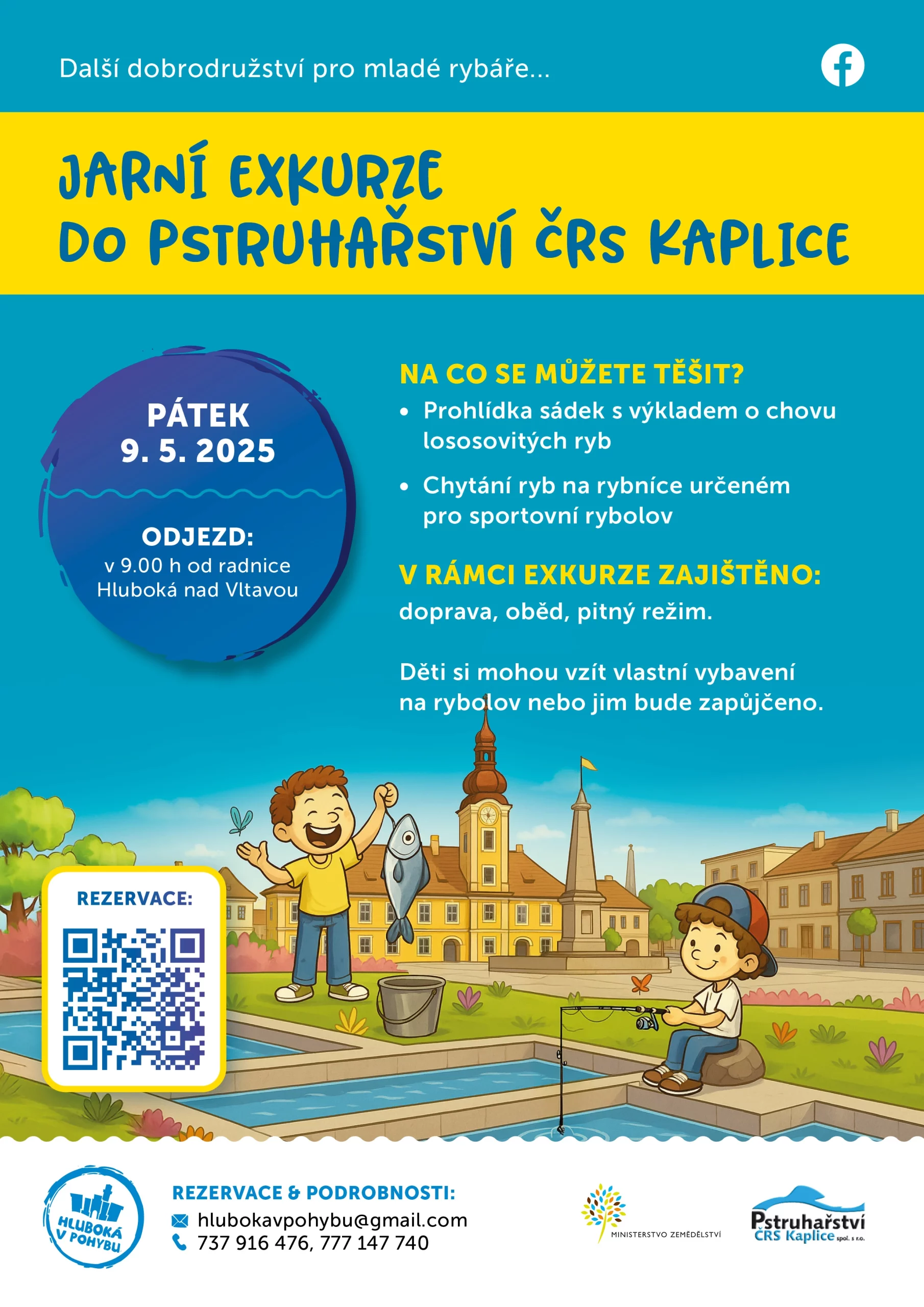Vydejte se s námi na nezapomenutelnou jarní výpravu za světem ryb, přírody a zábavy! Připravili jsme pro mladé rybáře jedinečnou exkurzi do pstruhařství ČRS Kaplice, kde děti nahlédnou přímo do zákulisí chovu lososovitých ryb a zažijí den plný nových zážitků.