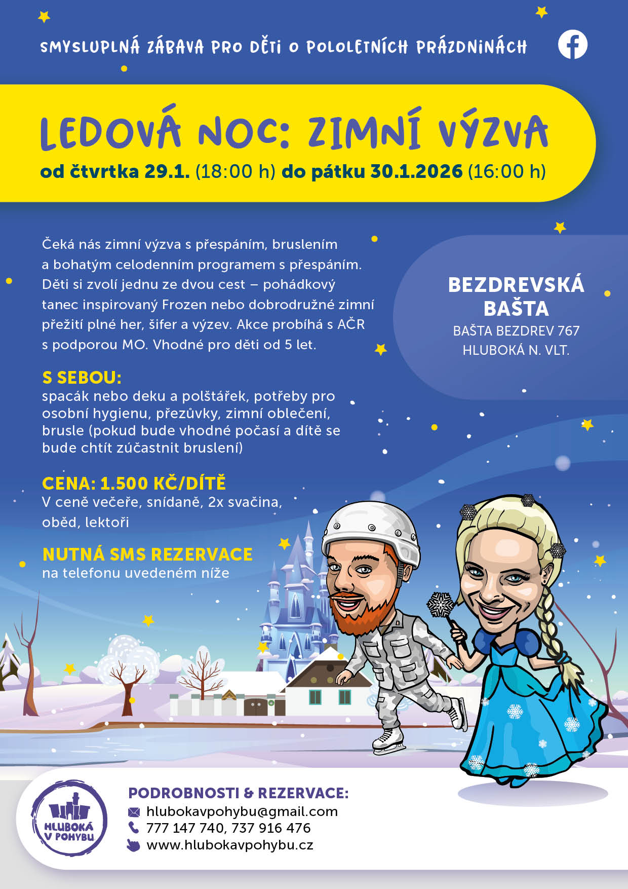 Čeká nás zim­ní výzva s přespá­ním, brus­le­ním a boha­tým celo­den­ním pro­gra­mem s přespá­ním. Děti si zvo­lí jed­nu ze dvou cest – pohád­ko­vý tanec inspi­ro­va­ný Fro­zen nebo dob­ro­druž­né zim­ní pře­ži­tí plné her, šifer a výzev. Akce pro­bí­há s AČR s pod­po­rou MO. Vhod­né pro děti od 5 let.