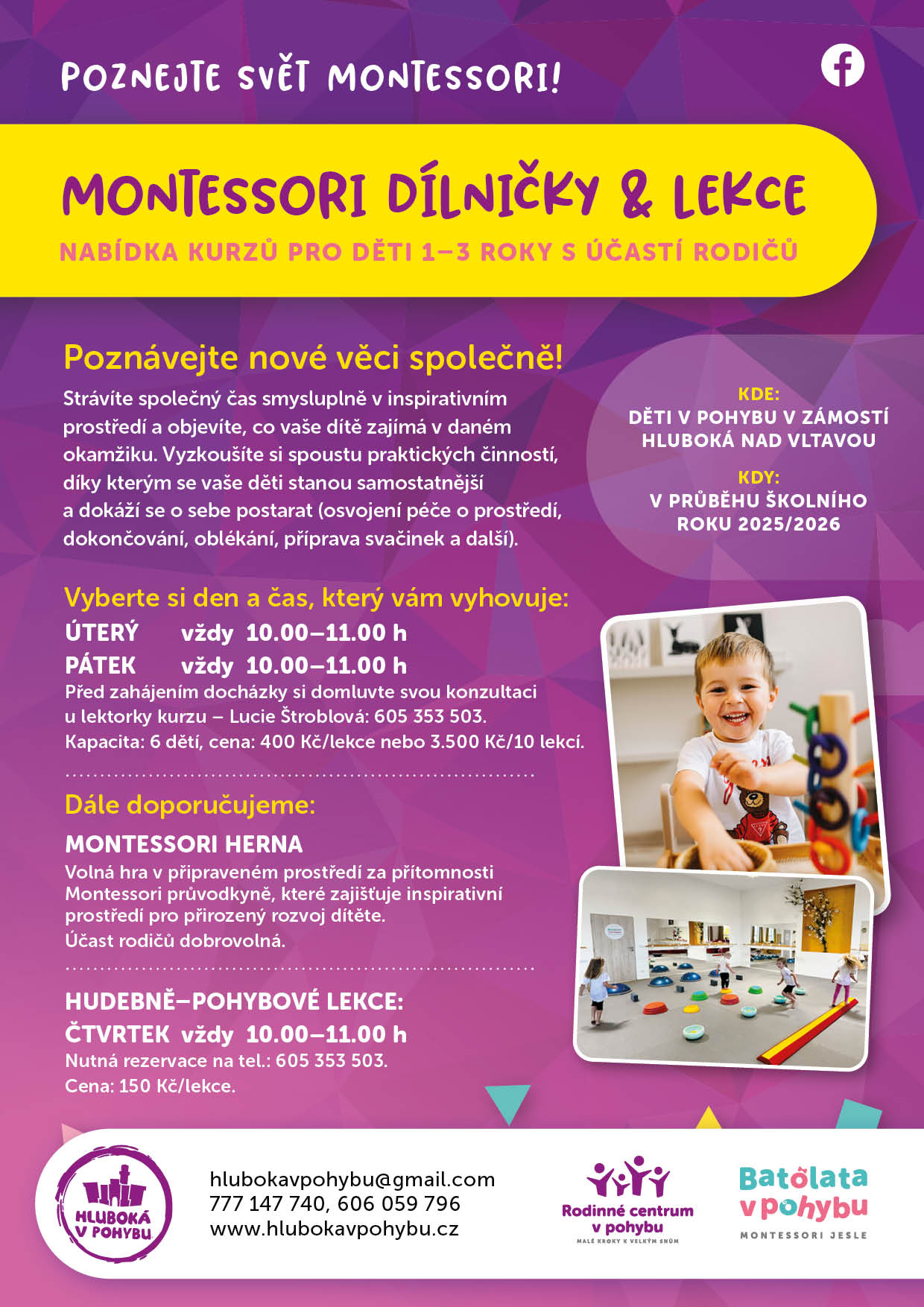 Strávíte společný čas smysluplně v inspirativním prostředí a objevíte, co vaše dítě zajímá v daném okamžiku. Vyzkoušíte si spoustu praktických činností, díky kterým se vaše děti stanou samostatnější a dokáží se o sebe postarat (osvojení péče o prostředí, dokončování, oblékání, příprava svačinek a další).