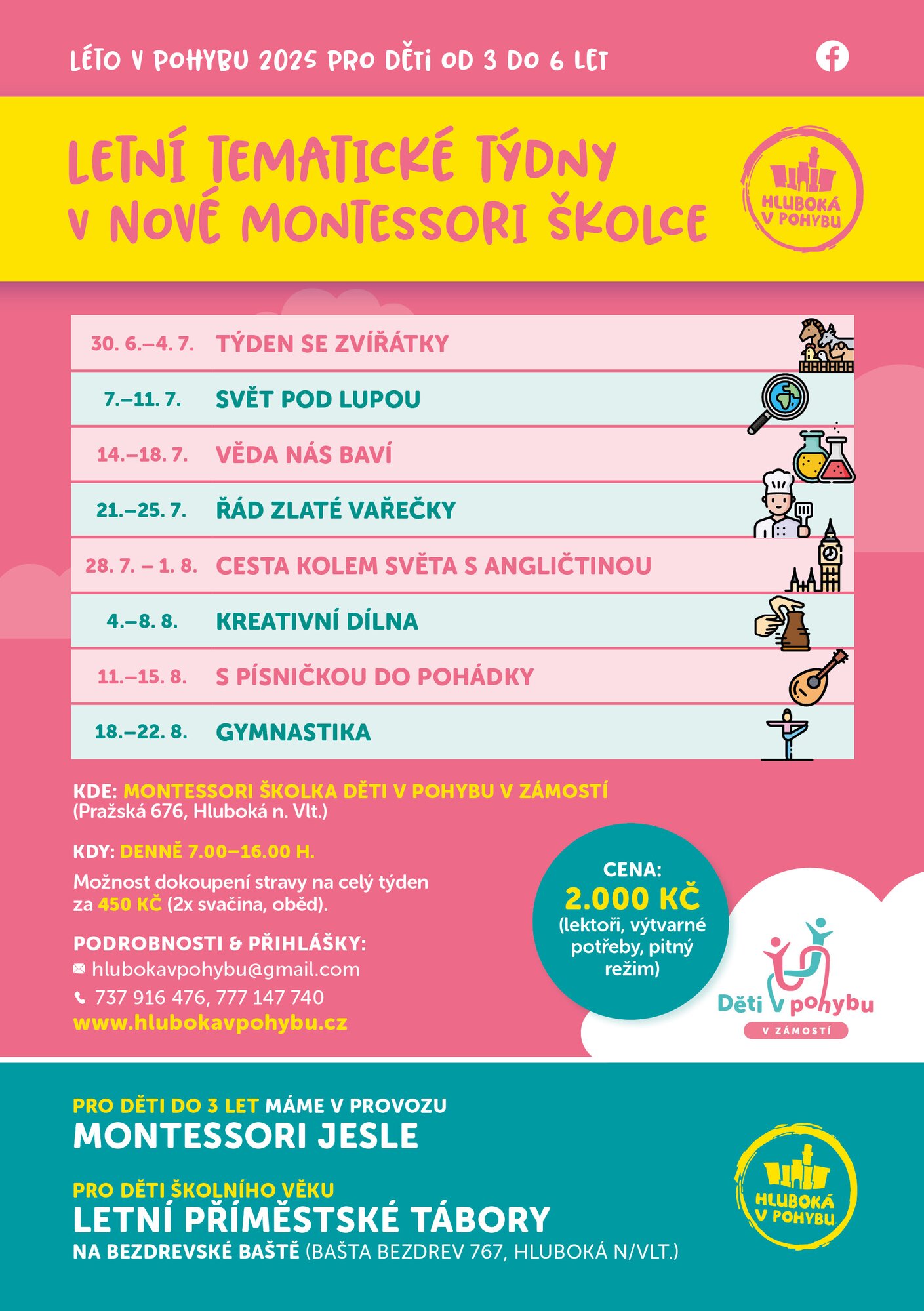 Během letních prázdnin se uskuteční tematické týdny v naší nové Montessori školce v Hluboké–Zámostí. V provozu budou i naše Montessori jesle Batolata v pohybu.